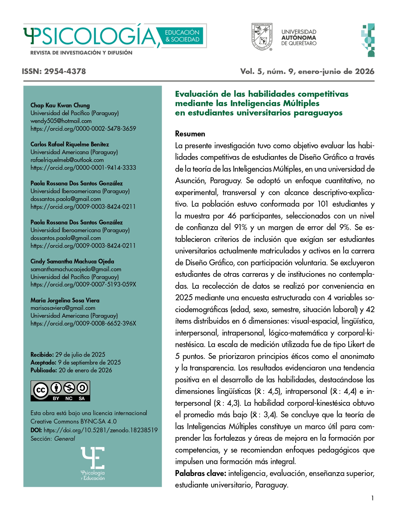 Habilidades competitivas mediante las Inteligencias Múltiples en estudiantes universitarios paraguayos. (2026). Psicología, Educación & Sociedad, 5(9). https://doi.org/10.5281/zenodo.18238519