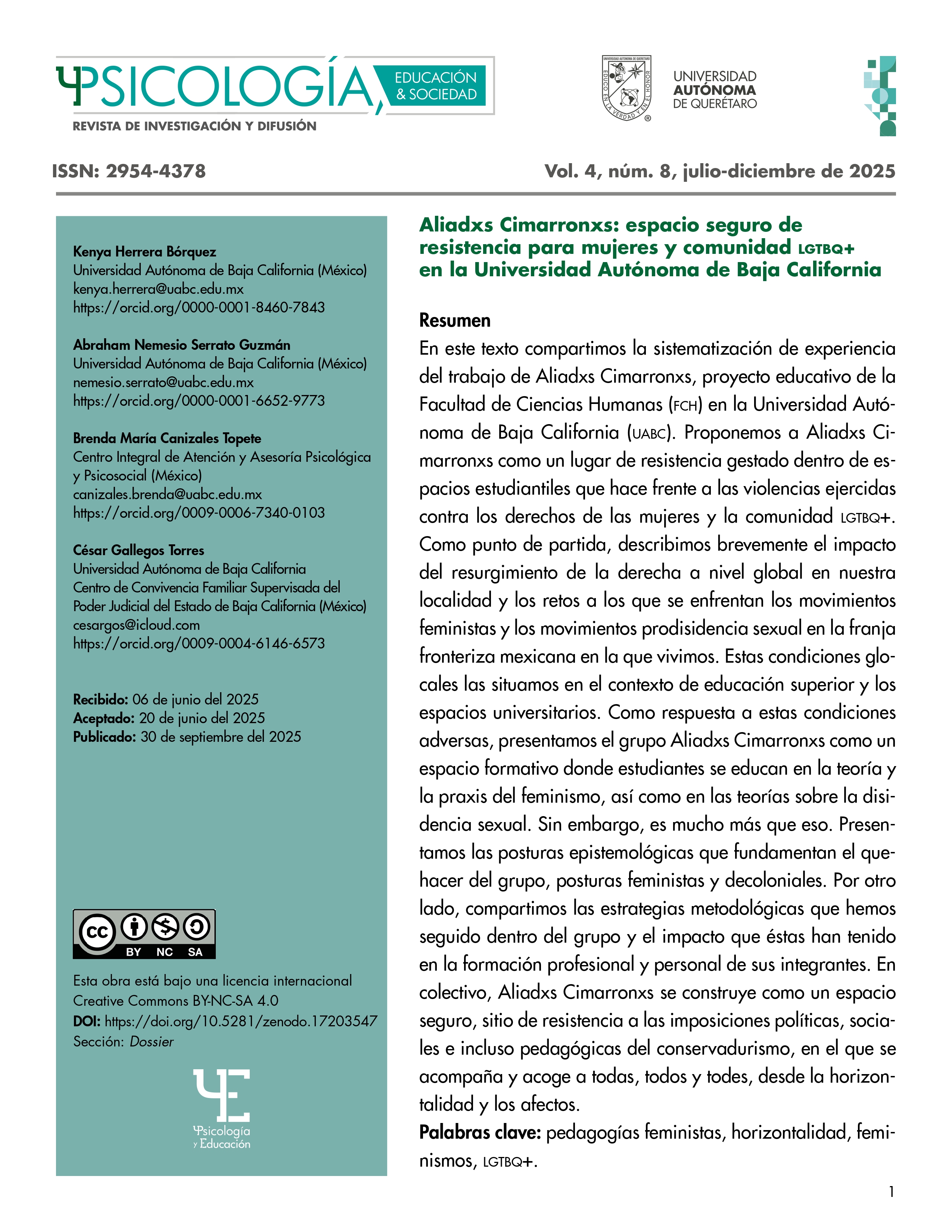 En este texto compartimos la sistematización de experiencia del trabajo de Aliadxs Cimarronxs, proyecto educativo de la Facultad de Ciencias Humanas (FCH) en la Universidad Autónoma de Baja California (UABC). Proponemos a Aliadxs Cimarronxs como un lugar de resistencia gestado dentro de espacios estudiantiles que hace frente a las violencias ejercidas contra los derechos de las mujeres y la comunidad LGTBQ+. Como punto de partida, describimos brevemente el impacto del resurgimiento de la derecha a nivel global en nuestra localidad y los retos a los que se enfrentan los movimientos feministas y los movimientos prodisidencia sexual en la franja fronteriza mexicana en la que vivimos. Estas condiciones glocales las situamos en el contexto de educación superior y los espacios universitarios. Como respuesta a estas condiciones adversas, presentamos el grupo Aliadxs Cimarronxs como un espacio formativo donde estudiantes se educan en la teoría y la praxis del feminismo, así como en las teorías sobre la disidencia sexual. Sin embargo, es mucho más que eso. Presentamos las posturas epistemológicas que fundamentan el quehacer del grupo, posturas feministas y decoloniales. Por otro lado, compartimos las estrategias metodológicas que hemos seguido dentro del grupo y el impacto que éstas han tenido en la formación profesional y personal de sus integrantes. En colectivo, Aliadxs Cimarronxs se construye como un espacio seguro, sitio de resistencia a las imposiciones políticas, sociales e incluso pedagógicas del conservadurismo, en el que se acompaña y acoge a todas, todos y todes, desde la horizontalidad y los afectos.