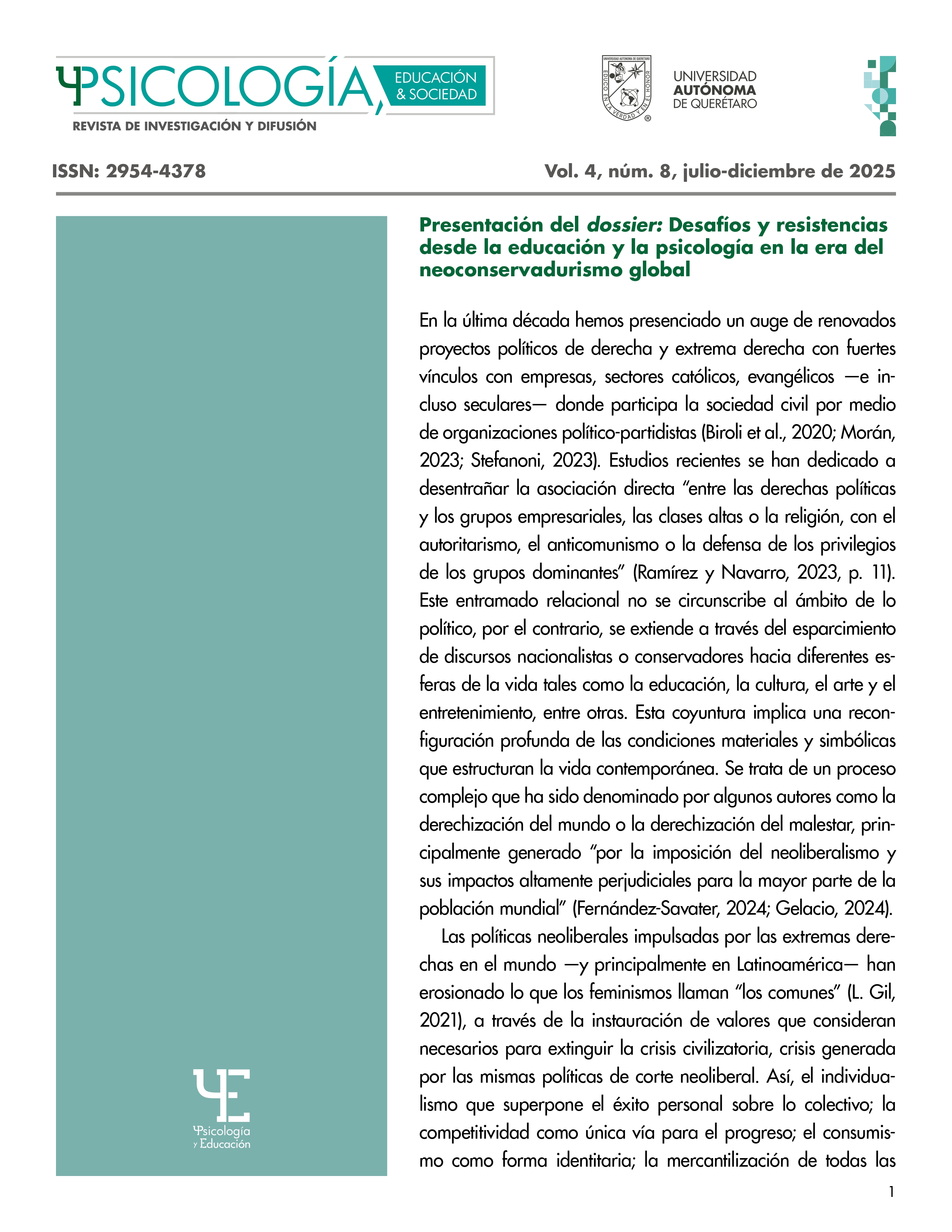 Presentación del dossier: “Desafíos y resistencias desde la educación y la psicología en la era del neoconservadurismo global”. (2025). Psicología, Educación & Sociedad, 4(8). https://doi.org/10.5281/