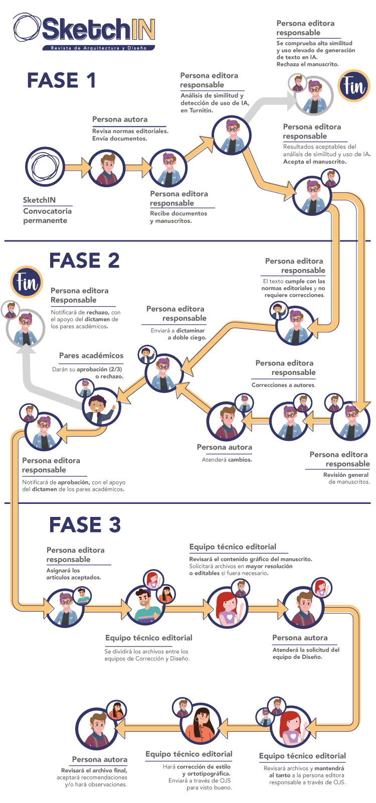El flujo editorial de SketchIN. Revista de Arquitectura y Diseño se divide en tres fases principales, cada una con acciones específicas y personas involucradas para asegurar un proceso organizado y eficiente. En la primera fase, la persona autora envía el manuscrito a la revista. La persona editora recibe el artículo a través de la plataforma OJS y realiza una primera revisión para verificar que cumple con los normas editoriales. Posteriormente, evalúa el artículo a través del software Turnitin. La persona editora decide si es aceptado para revisión por pares o rechazado.